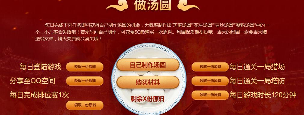 每日完成下列任务即可获得自己制作汤圆的机会,大概率制作出“芝麻汤圆”“花生汤圆”“豆沙汤圆”“蟹粉汤圆”中的一个, 小几率会失败哦!若无时间自己制作,可花费5Q币购买一次原料。汤圆保质期很短哦,当天的汤圆一定要当天赠送给女神,隔天变质就会消失哦!