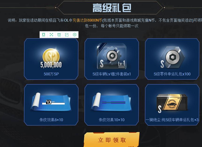 说明:玩家在活动期间在极品飞车OL中充值达到6900N币(包括本页面和游戏商城充值N币,不包含页面抽奖活动)可领取高级礼包一份, 每个帐号只能领取一次