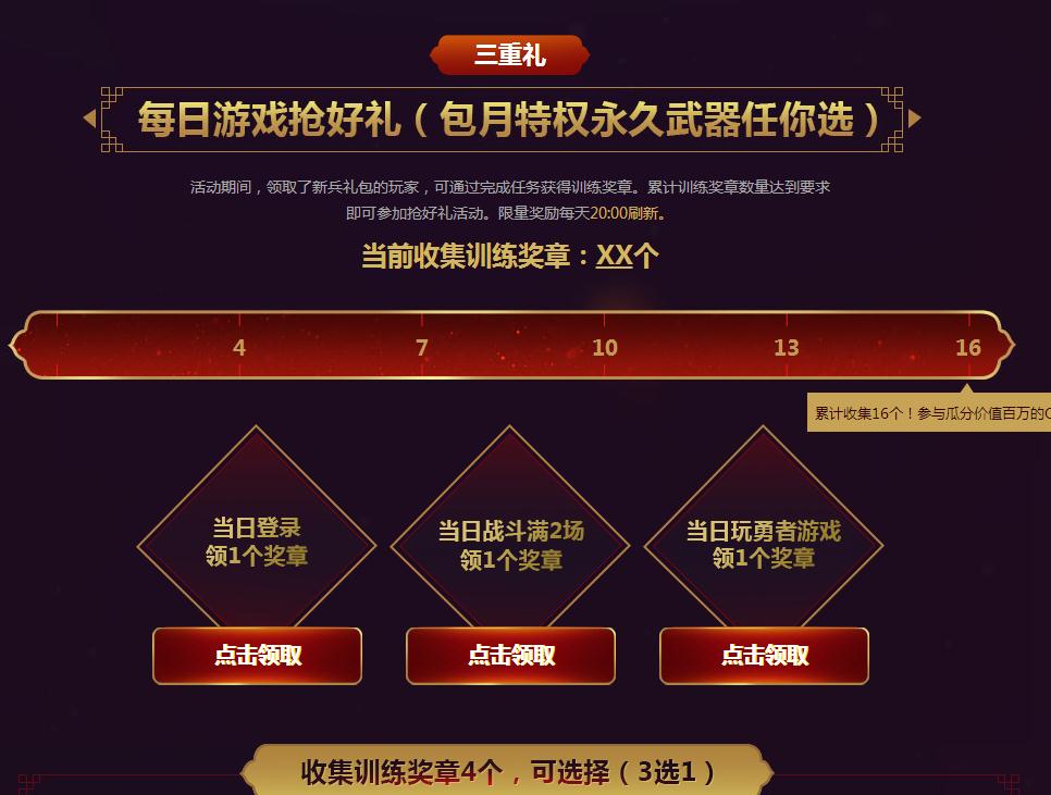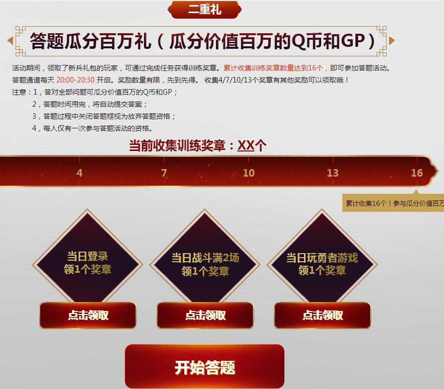 活动期间,领取了新兵礼包的玩家,可通过完成任务获得训练奖章。累计收集训练奖章数量达到16个,即可参加答题活动。