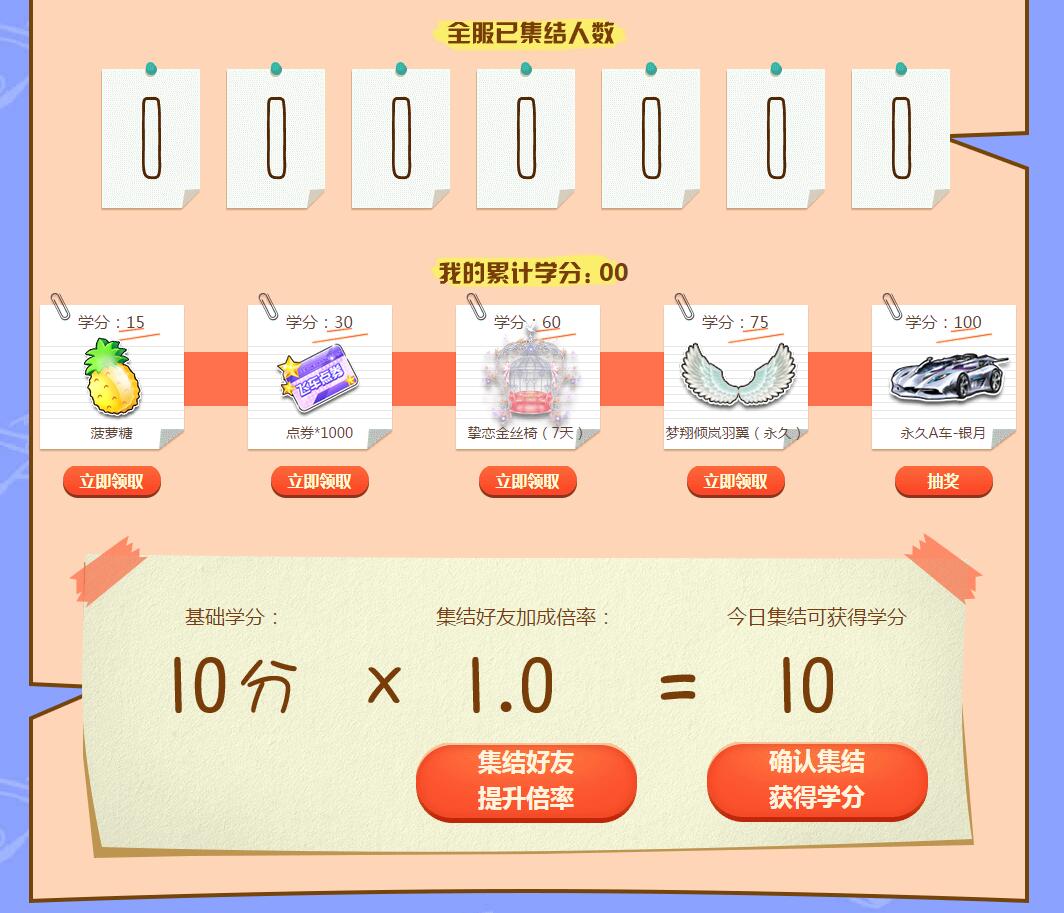 1、活动期间,每天登录游戏可在页面中进行开学集结,每次集结可获得学分,每天可集结1次。