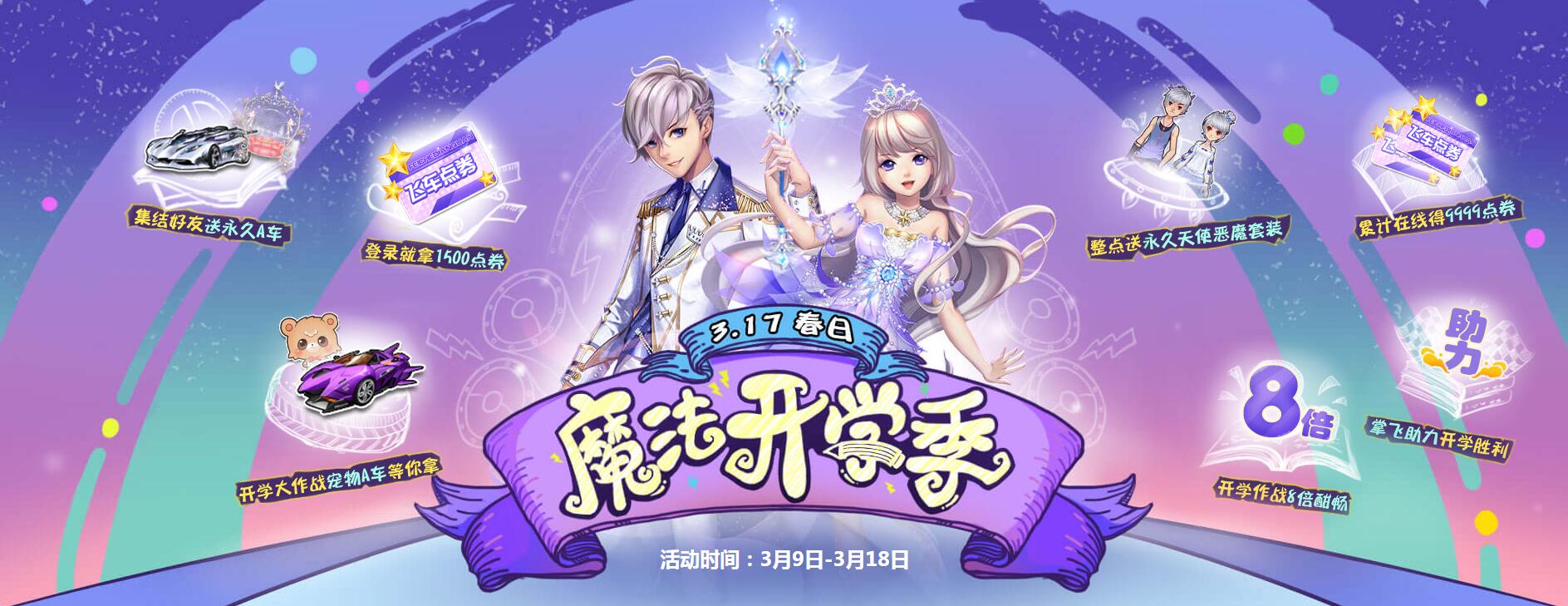 《QQ飞车》魔法开学季将于3月9日开启,完成任务,上万点卷、极品A车全民领,3月17日当天15:00整点还送永久天使恶魔套装,更有8倍助力升级。不仅如此,还有多重福利等你拿,下面跟着小编一起来看看吧。