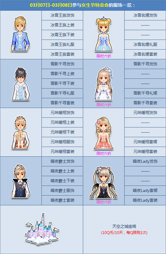《QQ飞车》女生节特卖会粉墨登场,极品双人座椅【天空之城座椅】唯美来袭,【冰雪王族/冰雪名媛套装】/【雪影千寻套装】/【元味暖栩套装】/【暗夜爵士/暗夜Lady套装】等服饰琳琅上架,其中女生套装限时六折献礼!