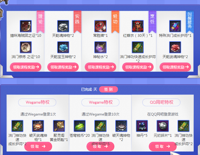 活动期间每天登录游戏,可以获得一次领取随机“2018五年洪门三年模拟”学习教辅资料的机会。阅读教辅资料,可以解锁一个对应的课程,并领取相应的解锁奖励。每种课程奖励只能领取一次。