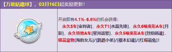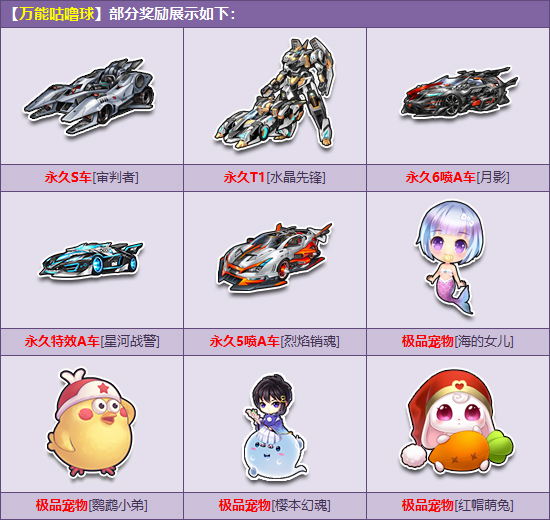 3月16日起,万能咕噜球奖励更新,开启即有机会获得:永久S车【审判者】,永久T1【水晶先锋】,永久6喷变形A车【月影】,永久特效A车【星河战警】,永久5喷变形A车【烈焰销魂】,极品宠物【海的女儿】/【鹦鹉小弟】/【樱本幻魂】/【红帽萌兔】!