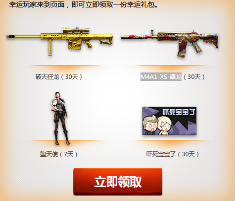 本期幸运大王见面礼包:破天狂龙(30天)、M4A1-XS-耀龙(30天)、堕天使(7天)