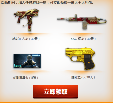 幸运大王大礼包:斯泰尔-赤龙(30天)、KAC-耀龙(30天)、幻影道具卡(5张)、胜利之火(30天)