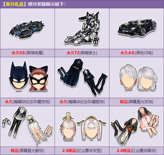 活动期间,购买角色经验卡+900,附赠【春分礼盒】,开启有机会获得:永久S车【黑域电魔】,永久T2【黑暗骑士】,永久A车【黑色闪电】,永久【蝙蝠侠纪念珍藏发饰/服饰】,极品【黑曜晨光发饰/服饰】!