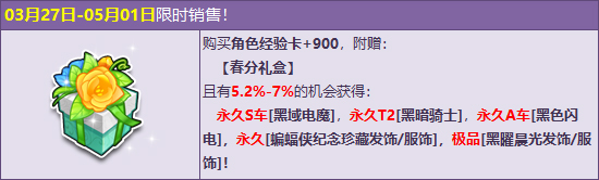 QQ飞车黑暗崛起,暗黑系极品道具登场!活动期间,凡购买【角色经验卡+900】将附赠春分礼盒,开启即可有机会获得永久S车、永久T2、永久A车、永久发饰等极品奖励。