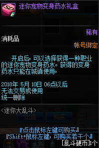 开启后,可以选择获得一种职业的迷你宠物变身药水,获得的变身药水只能在城镇使用