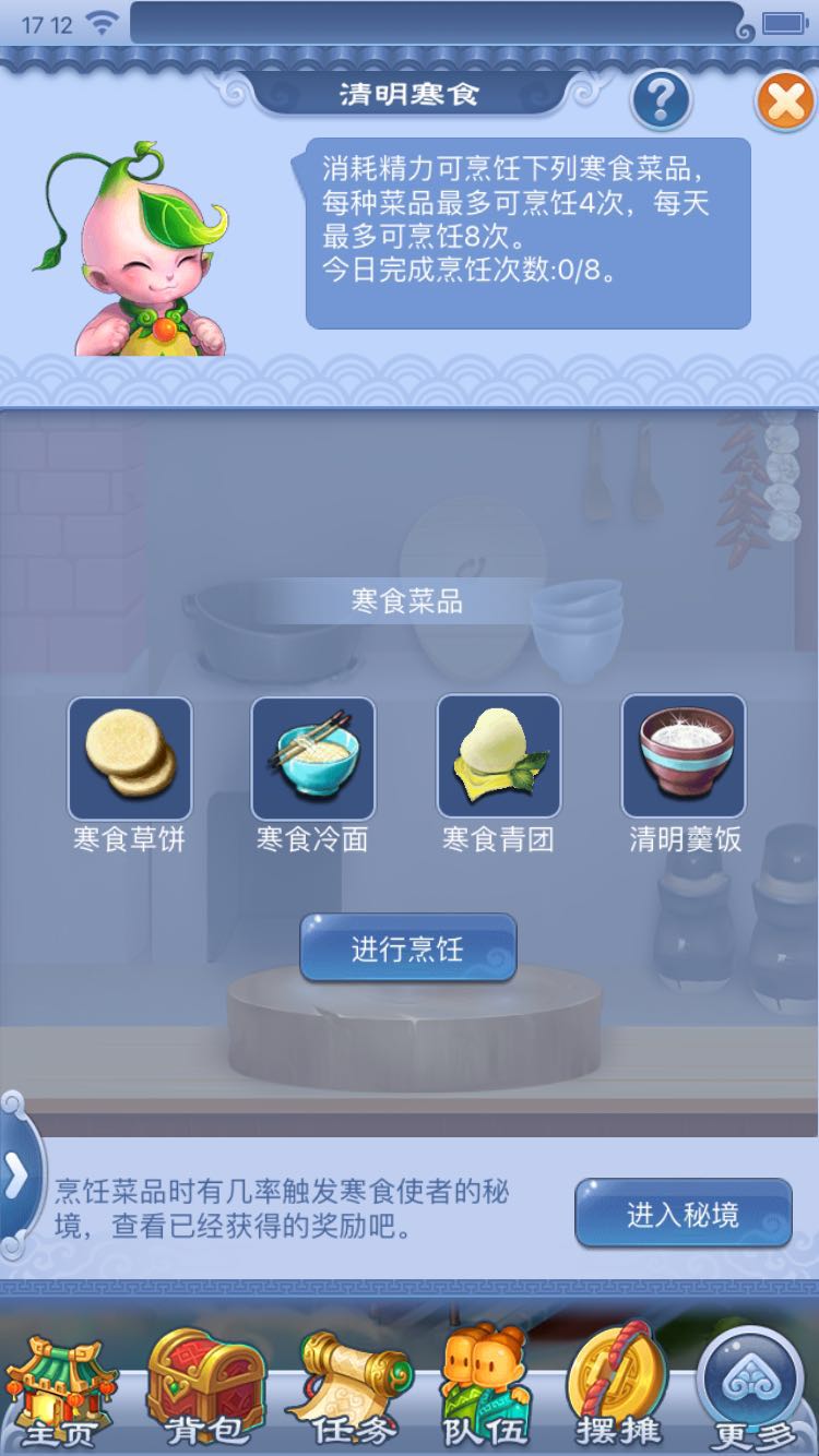 烹饪过程中玩家还有机会触发"寒食使者的秘境"在秘境小游戏中收集各类精粹,达到一定数量可消耗精力兑换奖励。兑换必得经验奖励,还有机会获得魔兽要诀、五宝、超级金柳露等随机物品奖励。