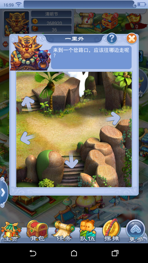 清明时节有踏青游乐的习俗,长安城郊有不少美丽的景致。玩家每天可以开启一次“踏青郊游”探索玩法,开启玩法不需要精力值。玩家在踏青郊游途中,根据提示进行探索:点击箭头进行寻路,还会遇到各类突发事件,包括小游戏、答题、战斗等。