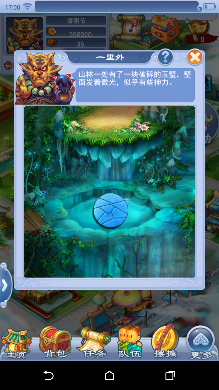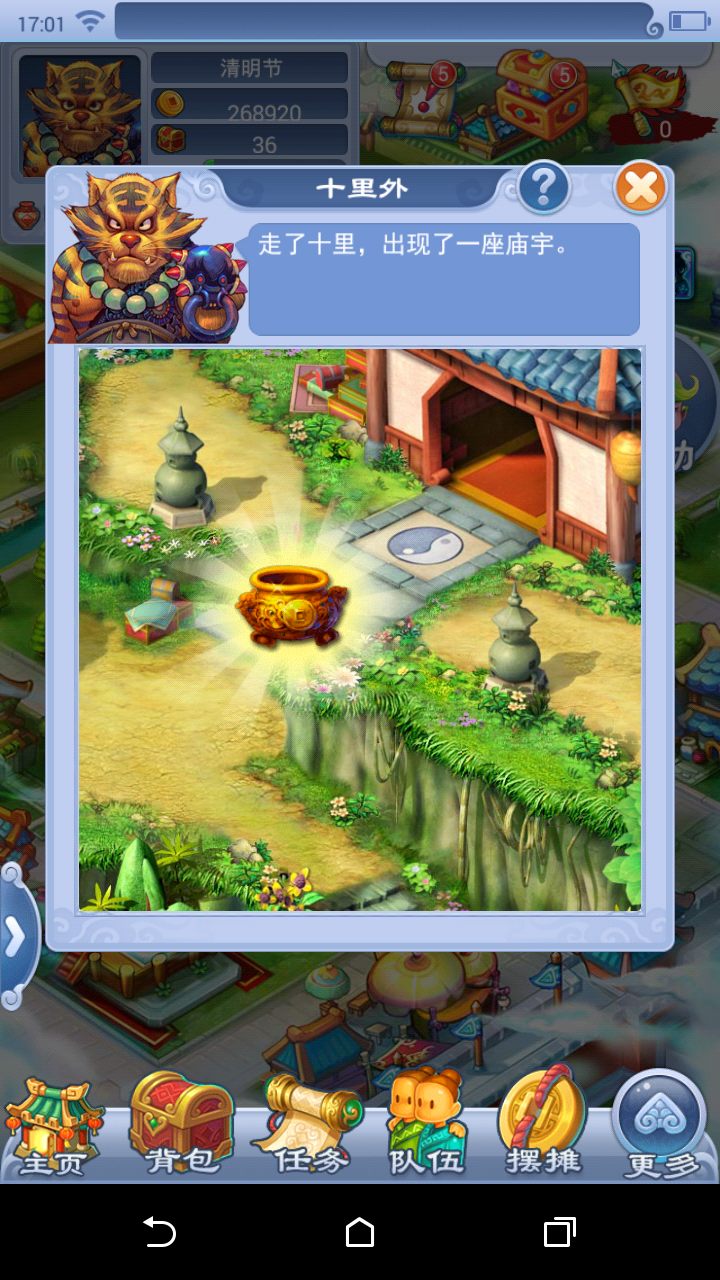 每次踏青郊游可行进十里。前9里,每一里行程都可获得1个“踏青宝藏”葫芦。完成第十里郊游,可获得1个“踏青秘宝”葫芦。 葫芦需要前往“宝库”-“特殊葫芦”中开启,每次开启消耗100精力,必定获得经验、储备金,还有机会获得五宝、摇钱树苗、星辉石等丰厚物品奖励。