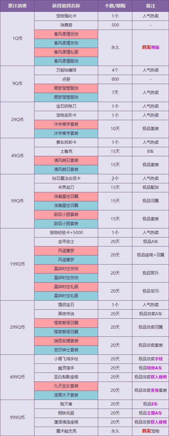 《QQ飞车》4月消费送好礼,4月1日期,累积消费达到不同的金额,即可获得相应的丰厚奖励。仅需消费1Q币即可获得首发绝版特色服饰春风柔情套装,还有首发极品宠物、极品S车、极品变身套装等豪礼。