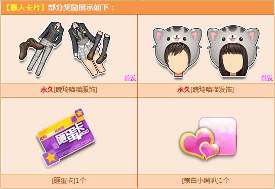 购【角色经验卡+10】,必得【愚人卡片】,且有几率必得4个奖励之一:永久【睆琦喵喵发饰】/【睆琦喵喵服饰】、【表白小喇叭】1个、【砸蛋卡】1个!