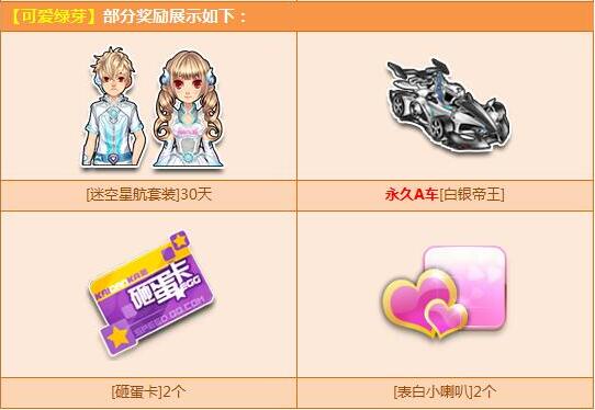 购【角色经验卡+100】,必得【可爱绿芽】,且有几率必得4个奖励之一:极品A车【白银帝王】、极品【迷空星航套装】、【表白小喇叭】2个、【砸蛋卡】2个!