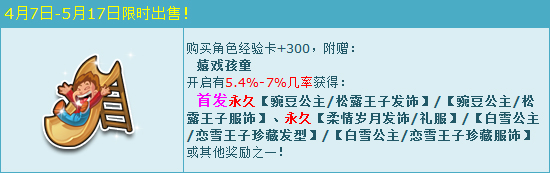 购买角色经验卡+300,附赠:嬉戏孩童,开启有5.4%-7%几率获得:首发永久【豌豆公主/松露王子发饰】/【豌豆公主/松露王子服饰】、永久【柔情岁月发饰/礼服】/【白雪公主/恋雪王子珍藏发型】/【白雪公主/恋雪王子珍藏服饰】或其他奖励之一!