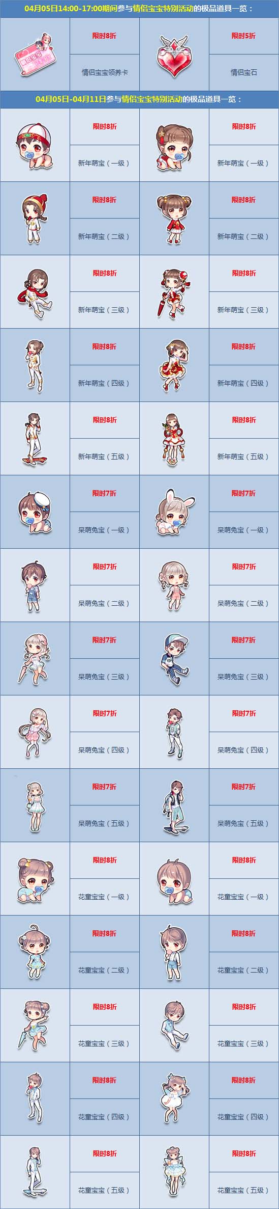 情侣宝宝特别活动甜蜜来袭,新年萌宝一~五级限时8折,呆萌兔宝一~五级限时7折,花童宝宝一~五级限时8折