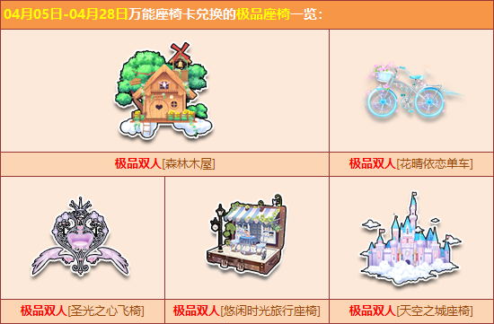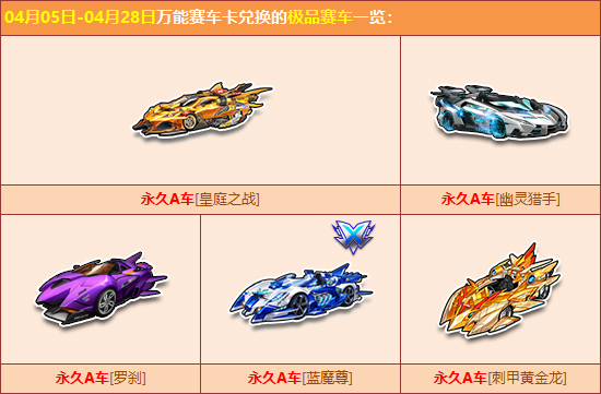 使用对应的万能卡片,即可在兑换商店中兑换永久A车【皇庭之战】/【幽灵猎手】/【罗刹】、极品双人座椅【森林木屋】/【花晴依恋单车】/【圣光之心飞椅】、极品宠物【胜利天使】/【小王子】等稀有奖励。