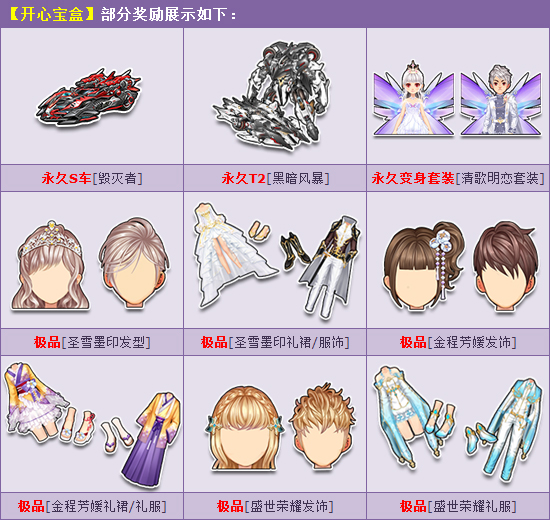 开心宝盒春日好礼 永久S+永久T2轻松赢!活动期间,凡购买【角色经验卡+900】将附赠开心宝盒,开启即可有机会获得永久S车、永久T2、永久变身套装等极品奖励。下面一起来看看吧。