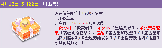 购买角色经验卡+900,获赠:开心宝盒,开启有几率获得:永久S车【毁灭者】、永久T2【黑暗风暴】、永久变身套装【清歌明恋套装】、极品【圣雪墨印发型】/【圣雪墨印礼裙/服饰】/【金程芳媛发饰】/【金程芳媛礼裙/礼服】或其他奖励之一!