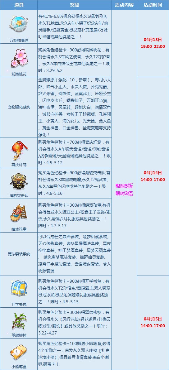 4月13日-15日每天固定时间段,【万能咕噜球】等各式宝箱及宠物幻化系统、魔法套装系统限时5折+3倍,有机会得永久T2【孙悟空】/【雷霆霸主】/【守护者】、永久S车【风之使者】/【黑域电魔】,首发永久双人座椅【扑克迷境座椅】以及其他各式极品!
