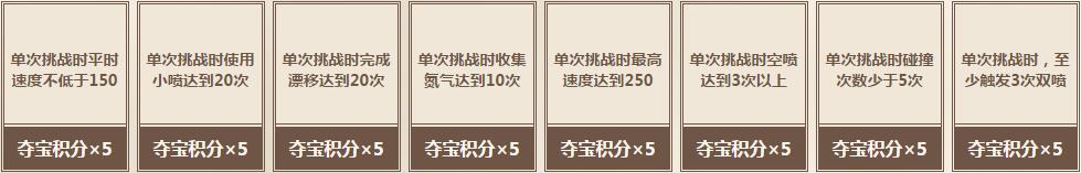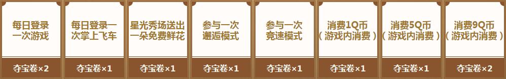 每天完成小橘子、白勇太、马特的挑战,可以获得夺宝积分,夺宝积分达到指定数字,即可100%获得宝箱中的奖励!