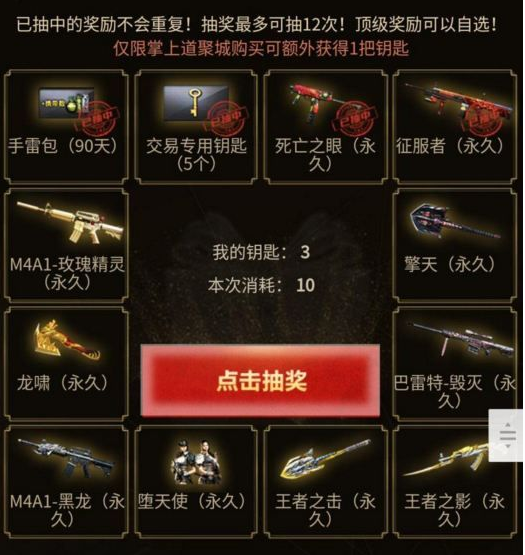 3.使用钥匙可以进行抽奖,并获得对应的奖励道具;