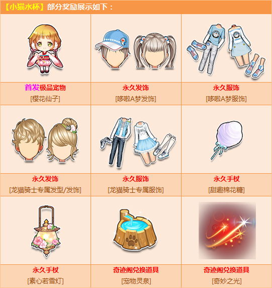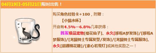 活动期间,购【角色经验卡+100】,附赠【小猫水杯】,有机会得首发极品宠物【樱花仙子】、永久【哆啦A梦发饰】/【哆啦A梦服饰】/【龙猫骑士专属发型/发饰】/【龙猫骑士专属服饰】、永久【素心若雪灯】/【甜趣棉花糖】、奇迹阁专属兑换物【宠物灵泉】/【奇妙之光】或其他奖励之一!