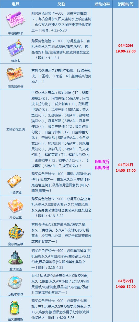 4月20日-22日每天固定时间段,【幸运眷顾卡】等各式宝箱及宠物幻化系统限时5折+3倍极品概率,有机会得首发永久双人座椅【扑克迷境座椅】、永久四人座椅【水上乐园座椅】、永久S车【终极变形销魂】/【时空战舰】、永久T2【火焰独角兽】/【猎魂裁决】以及其他各式极品