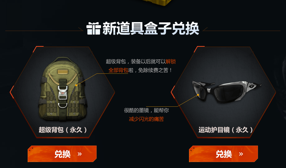 新道具盒子可以用于兑换:超级背包(永久)、运动护目镜(永久)