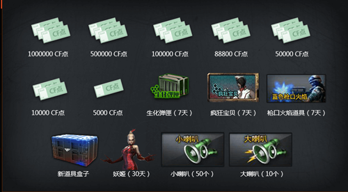 1000000cf点、500000cf点、100000cf点、88800cf点、50000cf点、10000cf点、5000cf点、生化弹夹(7天)、疯狂宝贝(7天)、枪口火焰道具(7天)、新道具盒子、妖姬(30天)、小喇叭(50个)、大喇叭(10个)