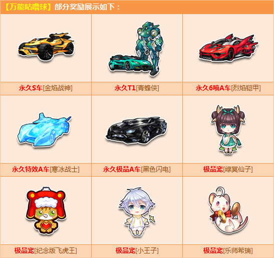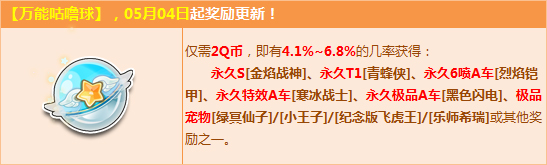 5月4日起,【万能咕噜球】更新,仅需2Q币就有4.1%~6.8%的几率获得永久S【金焰战神】、永久T1【青蜂侠】、永久A车【烈焰铠甲】/【寒冰战士】/【黑色闪电】、极品宠物【绿冥仙子】/【小王子】/【纪念版飞虎王】/【乐师希瑞】或其他奖励之一!