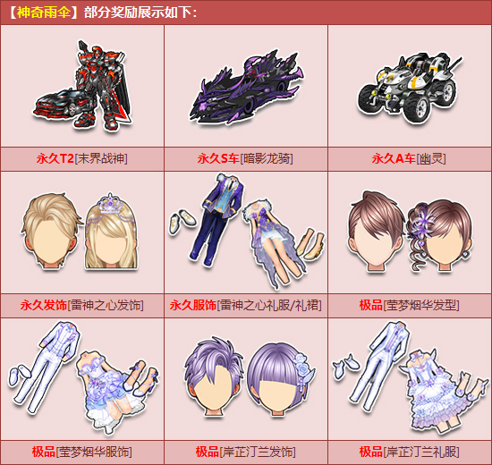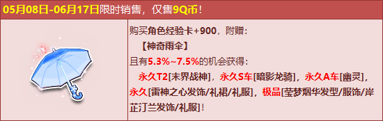 活动期间,购买角色经验卡+900,附赠【神奇雨伞】,有机会得永久T2【末界战神】,永久S车【暗影龙骑】,永久A车【幽灵】,永久【雷神之心发饰/礼裙/礼服】,极品【莹梦烟华发型/服饰/岸芷汀兰发饰/礼服】或其他奖励之一!