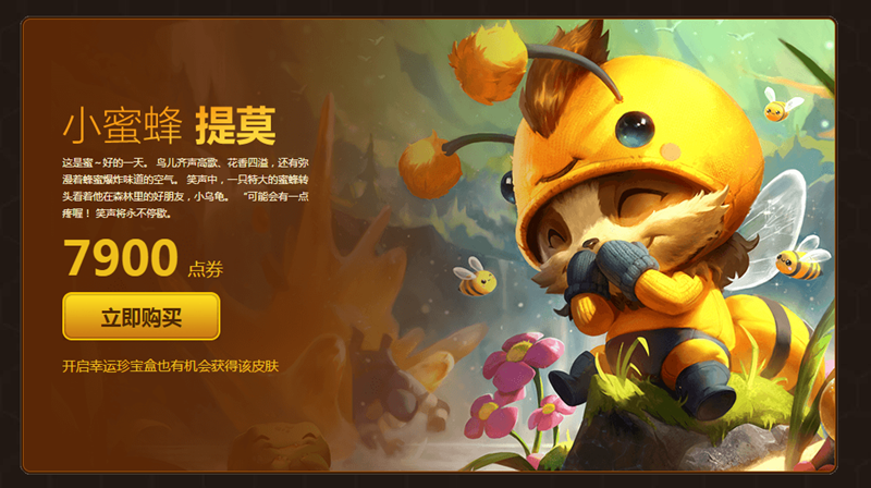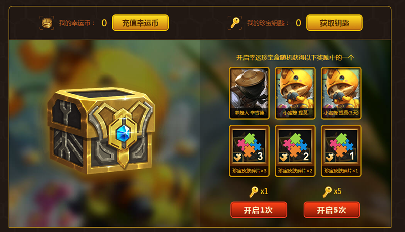 ※开启珍宝盒可能获得养蜂人 辛吉德、小蜜蜂 提莫 、小蜜蜂 提莫(3天)期限皮肤或1~3个珍宝皮肤碎片。