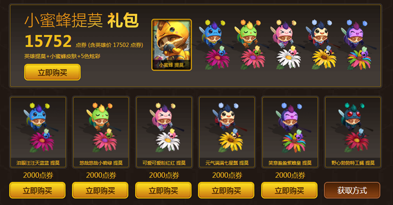 15752点券 (含英雄价 17502 点券) 英雄提莫+小蜜蜂皮肤+5色炫彩