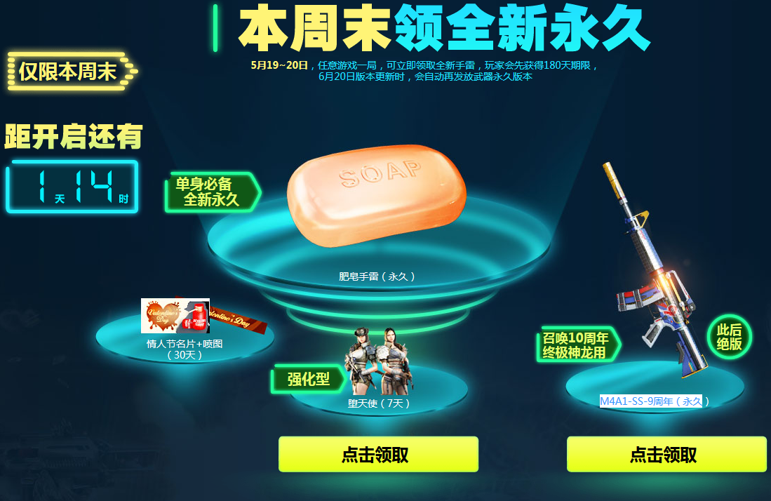 5月19~20日,任意游戏一局,可立即领取全新手雷,玩家会先获得180天期限,6月20日版本更新时,会自动再发放武器永久版本