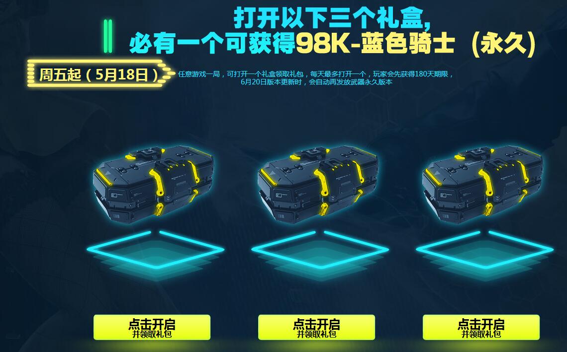 周五起(5月18日)任意游戏一局,可打开一个礼盒领取礼包,每天最多打开一个,玩家会先获得180天期限,6月20日版本更新时,会自动再发放武器永久版本点击开启并领取礼包点击开启并领取礼包