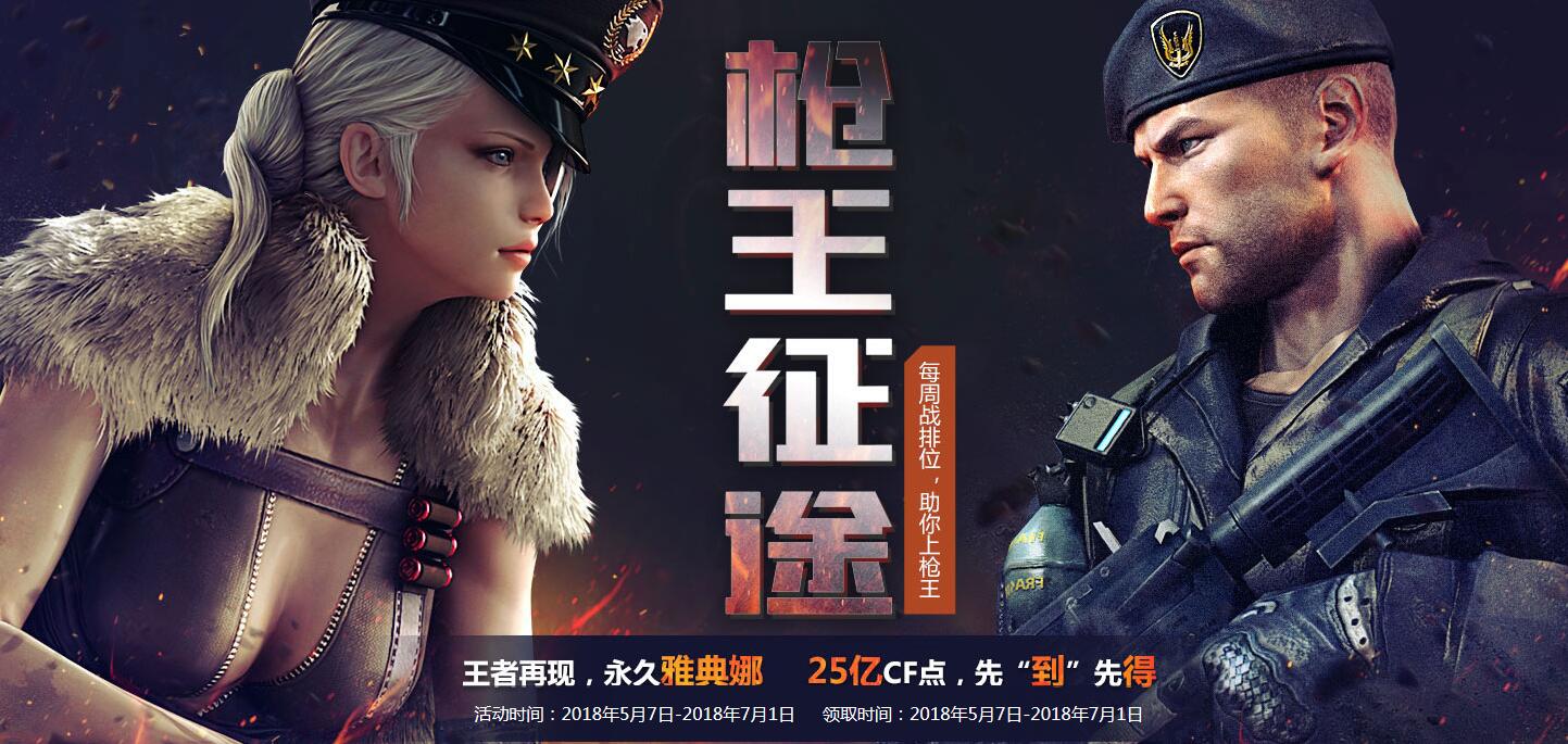 2018CF枪王征途活动正式开启,王者再现,送永久雅典娜,25亿CF点先到先得。每周战排位,助你上王者。下面小编就给打带来CF枪王征途活动地址及奖励详情,希望对大家有所帮助!