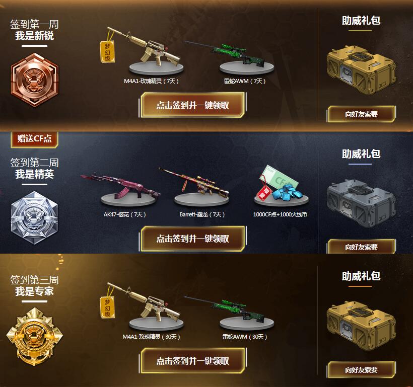 活动期间,玩家每周完成任务,可以在此页面签到一次(游戏内福利中心也可以签到),