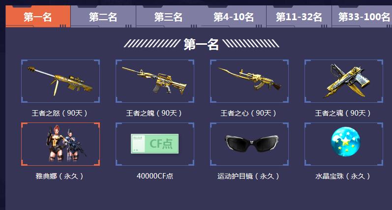 活动期间,玩家进行枪王排位爆破模式,累计胜利局数,累计胜利局数前100名可以获得以下丰厚奖励