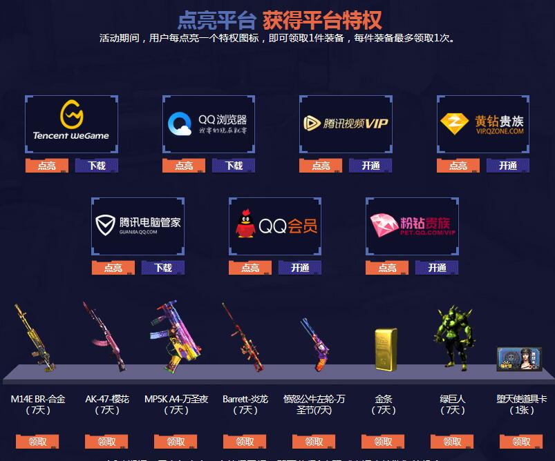 活动期间,用户每点亮一个特权图标,即可领取1件装备,每件装备最多领取1次。