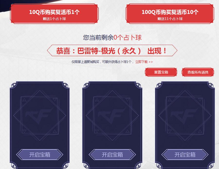 10QB购买复活币1个可获得1个占卜球,100QB购买复活币10个可获得11个占卜球