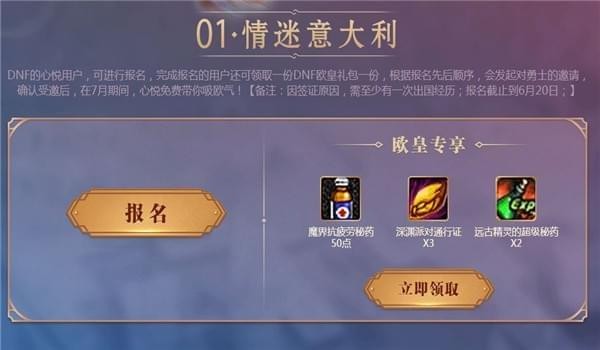 1.活动期间,DNF心悦用户可点击参与报名,申请参加意大利欧气之旅,完成报名的用户可领取礼包一份,单Q仅限一次;