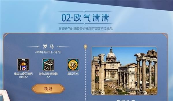 2.确认受邀后,在7月期间,心悦免费带你吸欧气!【备注:因签证原因,需至少有一次出国经历;报名截止到6月20日;】在规定的时间登录游戏即可领取行程礼包