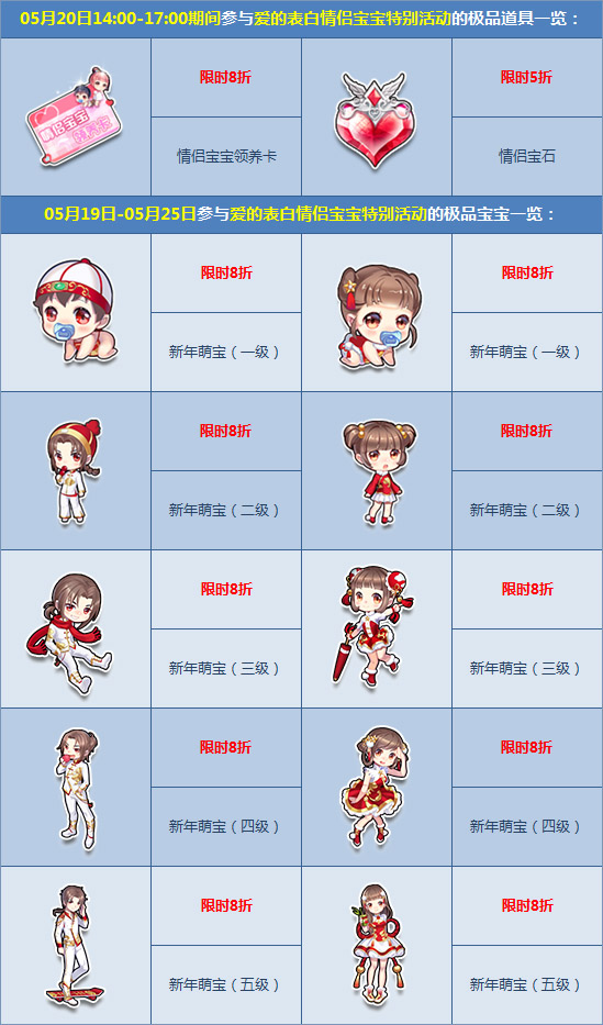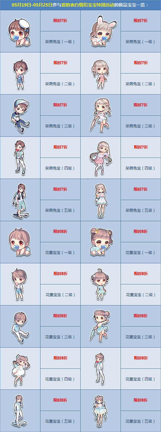 情侣宝宝特别活动甜蜜来袭,新年萌宝一~五级限时8折,呆萌兔宝一~五级限时7折,花童宝宝一~五级限时8折