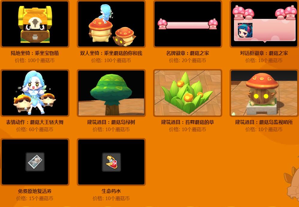 成功完成以上指定任务即可获得5个蘑菇币,蘑菇币可在露比的商店购买以下道具: