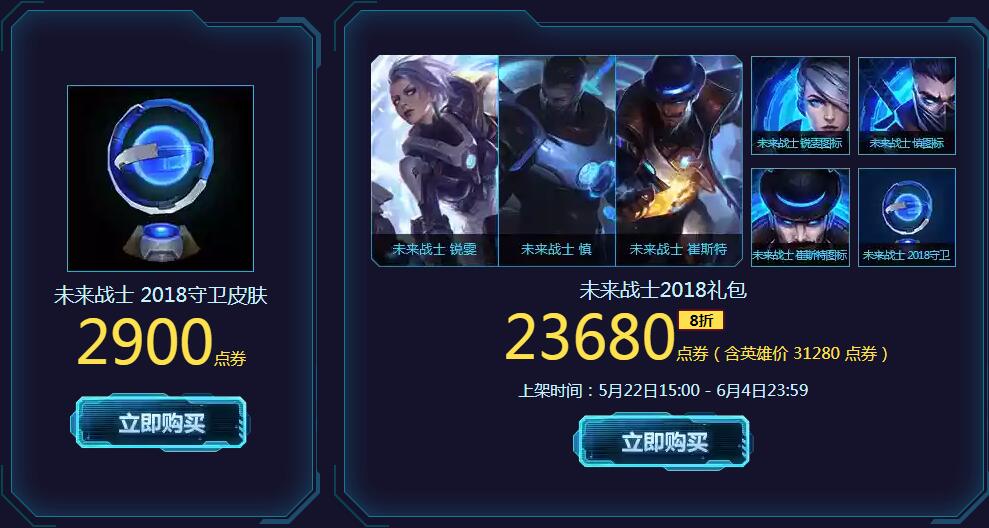 《英雄联盟》未来战士2018全新皮肤现已上线!活动期间内,玩家可前往活动页面通过购买幸运珍宝盒开启获得!开启获得的珍宝皮肤碎片也可兑换该系列皮肤,也可保留到下一次活动兑换。