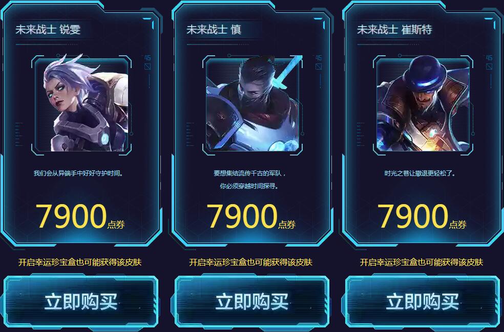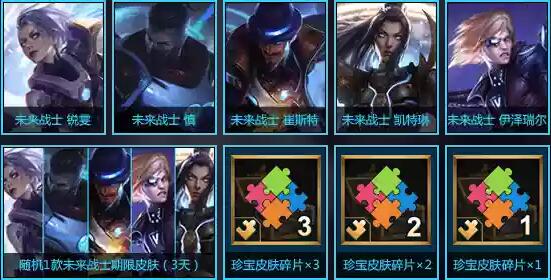 4、开启珍宝盒可能获得未来战士 伊泽瑞尔、未来战士 凯特琳、未来战士 锐雯、未来战士 崔斯特、未来战士 慎、未来战士 伊泽瑞尔(3天)、未来战士 凯特琳(3天)、未来战士 锐雯(3天)、未来战士 崔斯特(3天)、未来战士 慎(3天)期限皮肤或1~3个珍宝皮肤碎片。