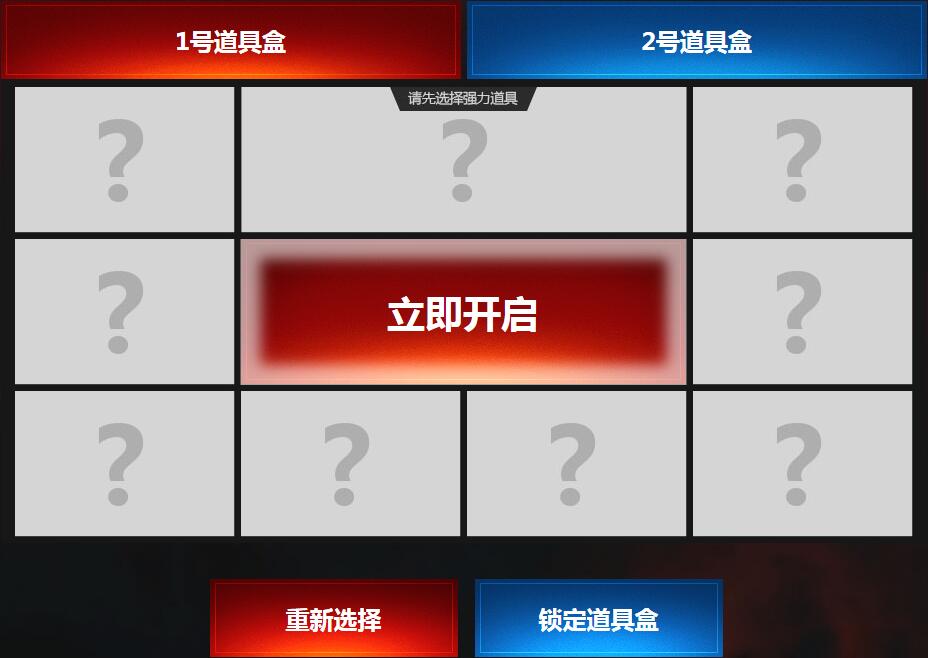 3、在道具箱中选定强力道具后,其他8个道具将随机生成。随后玩家可选择【锁定奖池】开始抽奖,或【重新选择】消耗2个碎片清空奖池重新定制道具箱内容,开启抽奖后无法重新选择。每个玩家最多定制2个道具箱并最多获得18个道具,每个道具箱有2次重置机会;