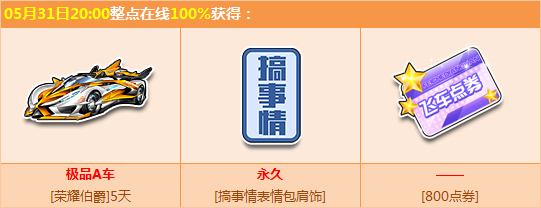 《QQ飞车》5月31日整点在线狂欢,好礼大放送!当天20:00整点在线100%送800点券、极品A车荣耀伯爵(5天)、搞事情表情包肩饰(永久),千万不要错过!